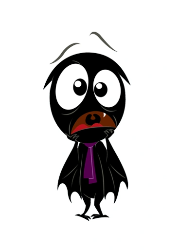 Scaredy Bat is a small black bat with one fang and a purple scarf around his neck.
